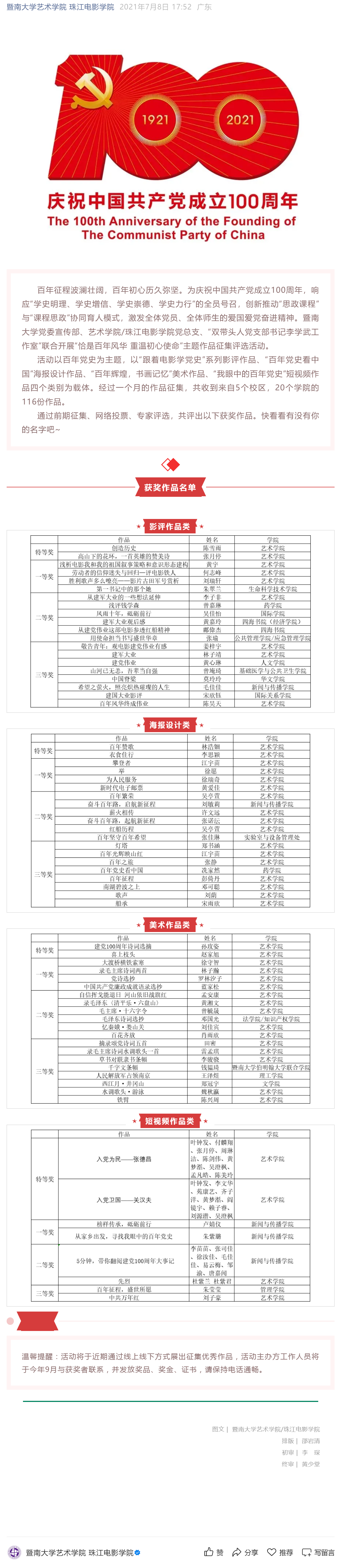 党史学习教育⑫ | “恰是百年风华 重温初心使命”主题作品征集评选活动获奖结果揭晓啦~
